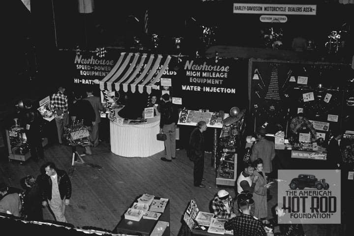 We can add a little more to the Newhouse story with our next overhead shot was taken at the Shrine Auditorium back in 1950 (REP_071). We got the shot from Pete (Robert E.) Petersen who was involved with producing it. He had Tom Medley go around the show (Hot Rod Expo III) and shoot a bunch of posed and unposed shots of which this is one. From the balcony, we see the Newhouse booth and a display of their go-fast parts. If you check out the girl under the awning covered area then look real close at the sign in front of her, it reads Speed and Power Handbook only $1.98.