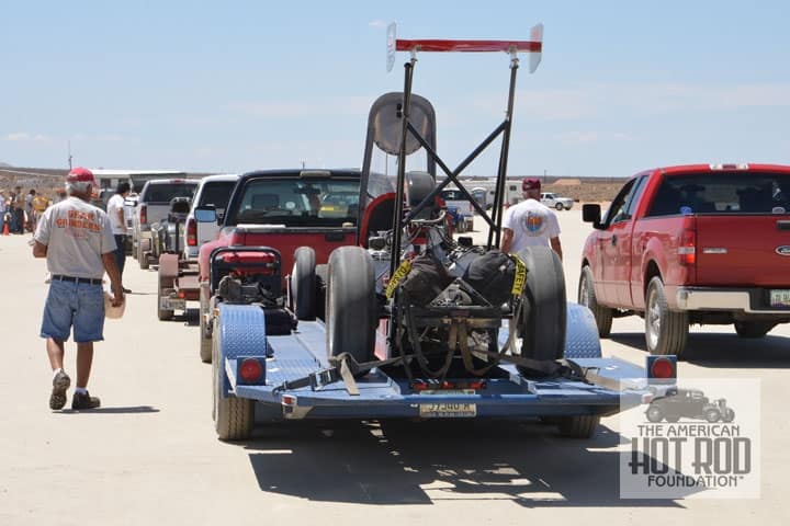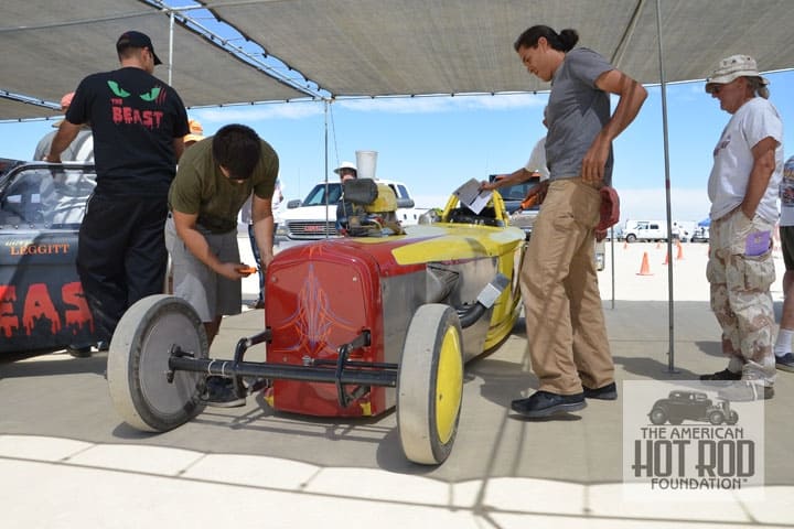 Back at the lakes, we see the Steinegger & Eshenbaugh Class D Fuel Lakester in line waiting to be inspected on Saturday, July 11, 2015, at El Mirage. Al Eshenbaugh, on the left, drove it through the lights on Sunday at a speed of 216.478 mph.