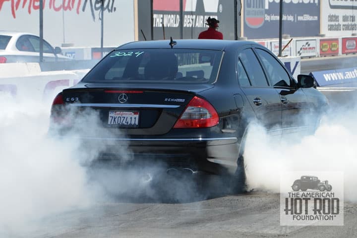 What really got us going was all the other newer rides we saw. Take for example what we think is a 2009 Mercedes Benz E 63. One look at the RENNtech tag on the right of the trunk says money pit for sure (JMC_5541). There was also a newer model Merc that made smoke just like this one along with a bunch of Z-cars etc. fitted with wide weenies. What blows you away is that these guys are all street driven. It looks like hi-tech street rodding is alive and well.
