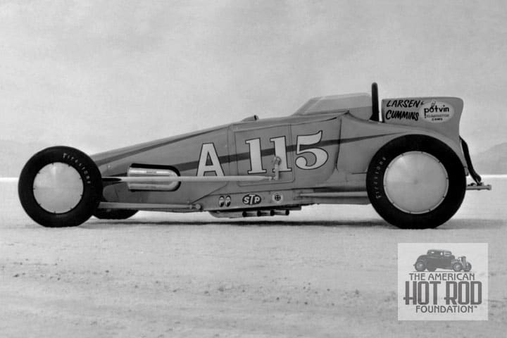 Last week we lead off with a drawing of the Larsen-Cummins Modified Roadster. This week we’ll lead off with a photo of the car taken in ‘65 at the salt from Fred’s own collection (FLC_215). You sharpies will note that we picked a shot that was taken 50 years ago as a tribute to some of the folks that were running car’s back then that are still messing with the go fast cars today. The Class A Modified Roadster was powered by a 444″ Supercharged Chrysler and was after it’s own 240.642 mph record set in 1963 with Fred behind the wheel. The unofficial results don’t have a speed listed because o the wet salt conditions. Sound familiar? To put the record in perspective the bottom of Class A today is 440” and the top 500.99” so Fred’s car just squeezed into it. The current A record stands at 307.555 mph and was set back in ‘91 by Jim Howe. When we look at the current B record it was set in ‘06 by Pete Prentice at 253.457 mph. Fred’s 240 record set five decades ago is indeed impressive even today.