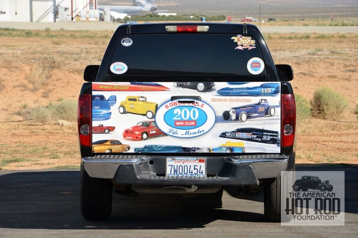 I couldn’t resist taking a picture of Dan Warner’s Colorado Tailgate. At Presdog of the Bonneville 200 mph club, one rarely sees it without a coat of salt (JMC_5558). A couple of years back we got some of the leftover wrap off of Wayne Jesel’s B-Ville pickup that ended up adorning Dan’s tailgate. A collision got Dan a new tailgate and when Wayne up-dated his hood with a color-wrap Dan sweet-talked him into this killer graphic.
