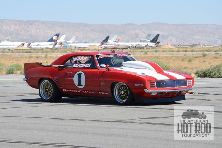 JMC_5570 shows the Big Red Camaro. This cool looking 1969 pony car went 232.4 mph back in April 2014 to set a benchmark speed at the track. Since this is a first-time event for the S.C.T.A. they limited first runs for everybody to 150 mph. This is the tow back to the pits shot after run two and the Red crew was still trying to find a tune for more speed.