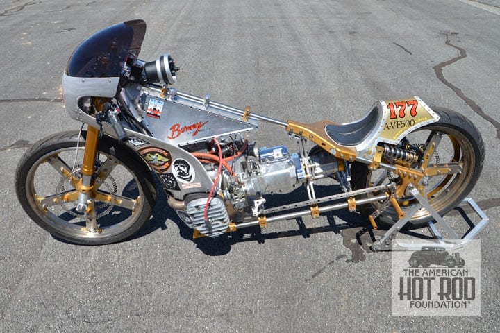 Here’s the coolest ride we spotted at the event (JMC_5573). This one came all the way from Russia and was a mix of art and ingenuity. The engine reminded us of an old old old BMW with exposed pushrods to actuate the two valves for each cylinder. Dig all the CNC bracketry that held everything together. And don’t forget the mini.brakes that look like their off a BMX bike. Best of all is the 2-piece CNC’ed gas tank that screwed together sporting the name Bonny Speed master. Cool!