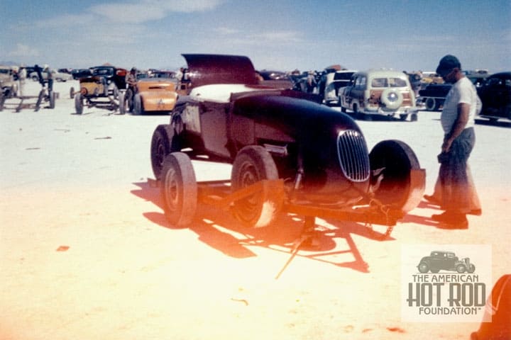 A few weeks ago we received a package from Mark Karolchik with some old B-ville shots. What’s cool about this shot is that it was taken in color (KCH_012). There was a light leak that messed up the lower portion of the film but we’ll take it any day. Up front, we see Gordon Potter Class D Modified Roadster that showed up at Bonneville in 1952 and kind of blew the socks off everybody. The number 501 was fairly conventional except for the mill which was one of those new-fangled Chrysler engines they called a Hemi. The 361-incher powered the brick to a speed of 153.51 mph for a fourth in class against the likes of Miller & Taylor and Stecker & Fugatt in their low slung rear engined jobs. A close look to the left in the rear will reveal the Miller & Taylor car in yellow with two circles painted around the nose by Eldon Snapp who designed the S.C.T.A. Winged Wheel logo before WWII.