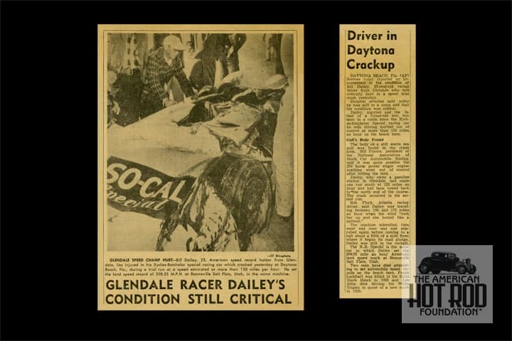 To continue the story, this week we were scanning a bunch of old newspaper clippings from the late ‘40 and early ‘50 courtesy of Chet Knox. Amongst them, we ran across the attached (CKC_2286) that was from the Glendale News-Press that we have dated from February 9, 1951. It gives us more incite to Daily accident at Daytona.