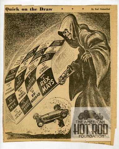 CKC_2304 is a clipping from an unidentified Los Angeles newspaper that was published right after the death of Rex Mays at Del Mar on November 6, 1949, showing 20 drivers that met their death in auto races in the last half of 1949. That year was particularly bad in the fatality department and as usual, the papers were drumming up support to ban auto racing, again. Note that Ed Haddad had perished a scant two weeks before Mays.