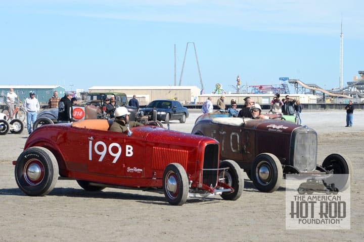 Could it be that these two Cowboys are trying to psych each other out before a possible matchup on the sand at The Race of Gentlemen in 2015? Brian Bass out of Dallas, Texas in his Candy Apple Red Deuce powered by a 330″ flattie and Scott McCann out of Westminister, Colorado in his old Bonneville racer powered by a 239″ flattie is seen just before heading to staging. They didn’t get to face each other in the eliminations and both made it to round two of the finals before being out dragged on the shifting sands of Wildwood Beach, New Jersey. Bummer, it would have been a great shootout to see who drew the fastest.