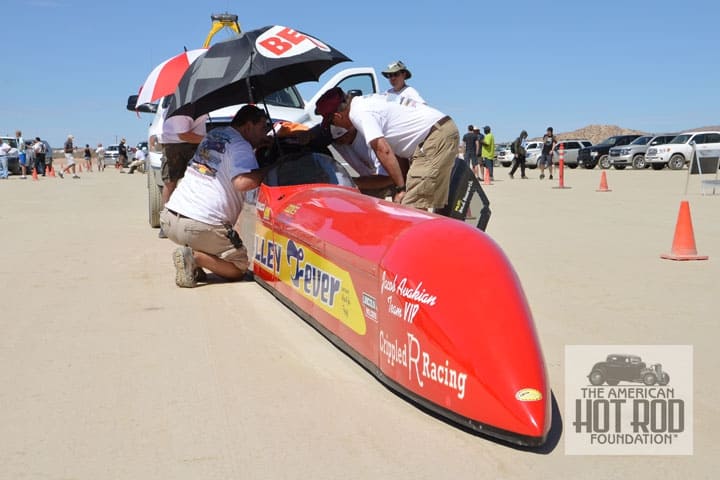 Driver Brad Bosworth has just climbed into the red Valley Fever Class H Blown Fuel Streamliner at El Mirage (JMC_5747). Pete on the left holding the umbrella and Keith on the right make sure he’s secure before the lid is secured and he took off. The record stood at 247.750 mph and gets to hang around some more as troubles forced Brad to coast through the lights at a slow 118.817 mph.