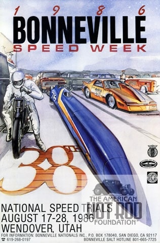 For our next image, we dug out a 1986 Bonneville poster that had been folded in half and in half again (JMC_5596). Instead of photographing it, we made four scans, put them together and retouched out the folds for you. The poster was the brainchild of our buddy Dan Warner. Seems a young Art Center student was up at Bonneville in ‘84 sketching cars for competitors to make a little side money. Eagle-eye Dan spotted the talented lad and talked him into doing the 1985 and 1986 Program Cover-Poster artwork. His name was Larry Erickson. Larry went on to gain fame working at General Motors, designing Cadzilla and building one far-out street roadster.