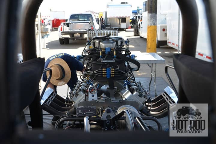 Manchen seems to know everybody. We stopped off in the Team High-Speed pits before qualifying to do a little jawing. They were getting the engine ready to fire it and had cranked up the box fan for a little clean air (JMC_5606). At the end of the day, they went home the winner of Top Fuel Dragster.