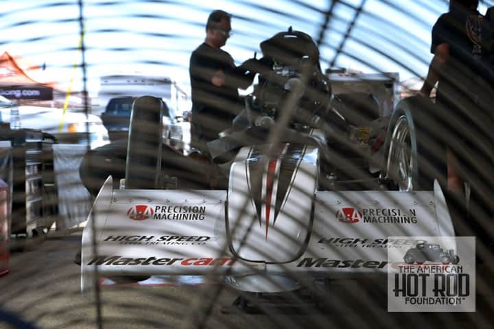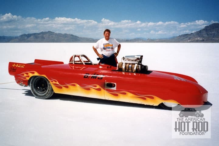 The next adventure and photo from ‘05 by Randy Lorentzen (JMC_5617) revolves around another Sidewinder, Ron Main. Bobby Walden (Walden Speed Shop) was driving the car at Bonneville and rolled it up into a ball. Ron tapped Rich to rebuild it and pretty soon I had a job at the shop. With tandem front wheels and a re-tweaked Flathead put together by Dick Landy, the car became the first Flathead-powered car to set a record over 300 mph, it’s deed was 302.674 mph with Ron driving. A deal with G.M. Performance meant out with the flat motor and in with an EcoTec 4-banger in ‘04 resulted in two records, Blown Fuel at 309.607 mph and Blown Gas at 290.567 mph.