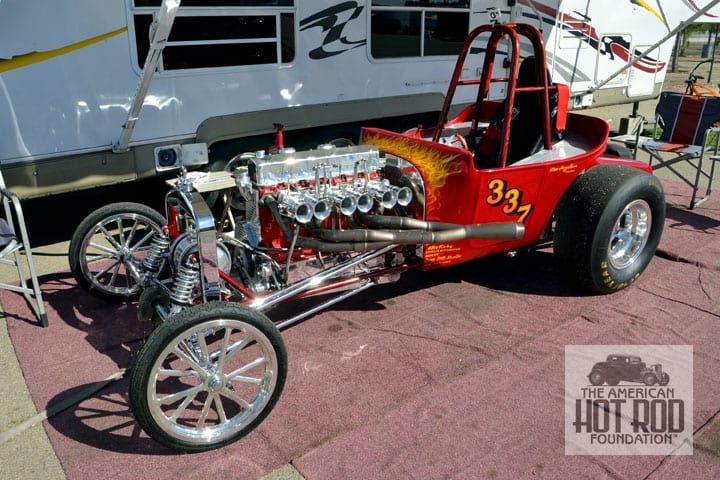 While cruising the pits we spotted this super-sano ride called the Tea Pot T. It was driven by Ron Angalone. Nice headers on the 6-banger and it sounded great too. It ran close to 150 wound tighter than a rubber band.