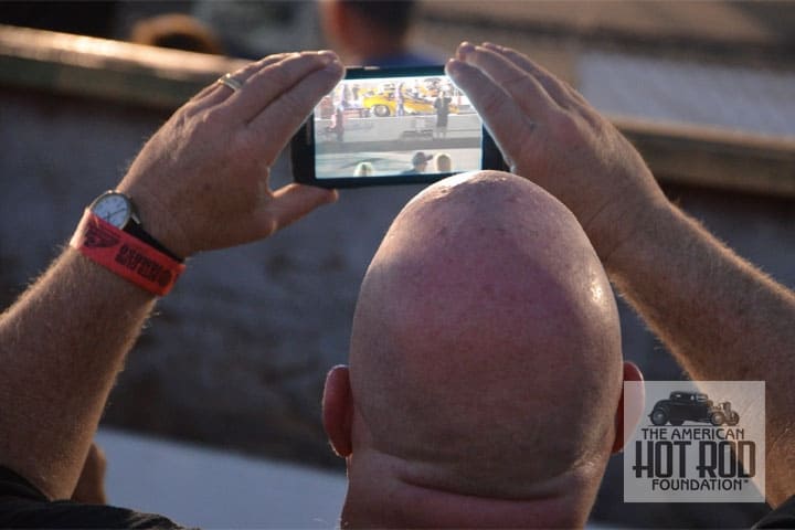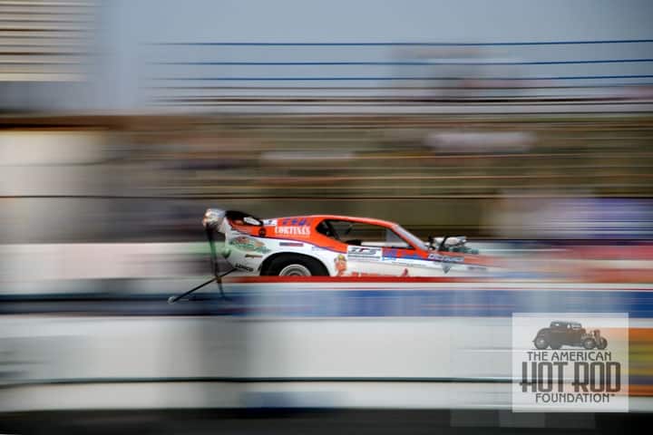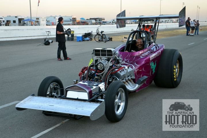 We see driver Rodney Flournoy flashing us a big smile while the fast cars are paraded by the folks in the grandstand (JMC_5608). We stopped by the Godzilla pits a couple of times. After their first round, we saw a video of the run shot by the camera above his head. They had a mysterious leak between the head and intake manifold that sucked air and screwed up the left bank’s great flames. Worse yet was their new set of Goodyear’s on the rear. Seems they expand more than their last set and decided to rub the inner body wells. The rubbing steered Rodney into the other lane right not so he had to shut off pronto.