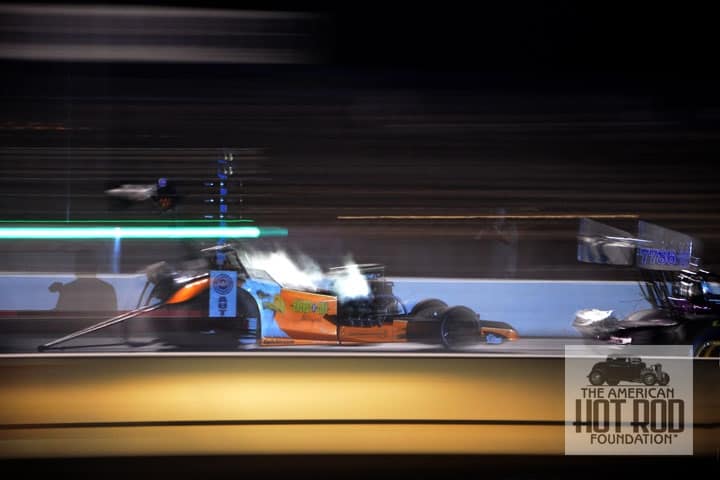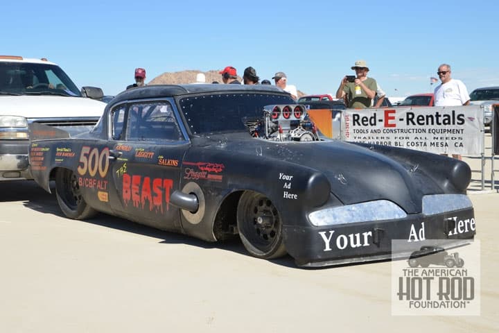 A while back we showed you a picture of the Arnold-Leggett-Salkins Stude cruising through the traps at El Mirage on July 12, 2015, with flames coming out of every opening possible. This shot shows the rebuilt Beast on the starting line on September 13. Driver Brandon Leggett made it farther down the track before the Nitro fueled motor hydrolyzed. A single Mag caused a misfire and the engine grenaded itself for the second meet in a row. Big Block Chrysler’s are expensive to repair. Note Manchen’s name over the rear wheel.