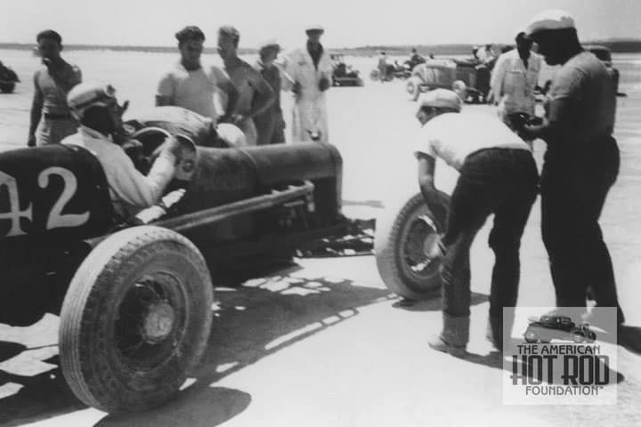 Let’s travel back to the year 1941 to have a look at a ride that was named “Polecat” (DOT_683) from the Julian Doty Collection. We see Low Flyers member Melvin Straw in his number 342 Model-T powered Streamliner fitted with an S.O. Fronty head getting some looks at Muroc on August 24, 1941. We speeds on the carat this meet but in June as a guest, Mel ran 105.01 mph. Car number 107 in the background was run by Idlers member George Thompson. It ran a milled V8. Again, we don’t have any speed on the car since good record keeping was an afterthought back then. Earlier at the June meet, George ran 105.14 mph.