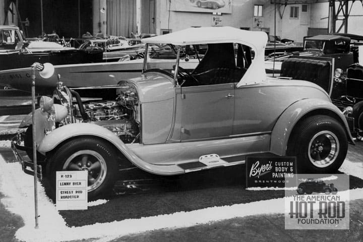 Lets fast forward 25 years for some more cool pictures that we got from Gary Hartsock. Lenny Byer from Brentwood presented his Poppy Red ’29 Ford Roadster for all to see at the 1966 Grand National Roadster Show (GHC_236). That a ’56 Chevy V8 in the engine bay that’s hooked to a ’39 Ford trans that feeds a ’40 rear end that was fitted with a quick change. Inside there’s a modified Deuce dashboard and black diamond tufted Naugahyde. That’s a ’52 Ford steering setup and let’s not forget the chromed running gear and a step-plate on the running board.