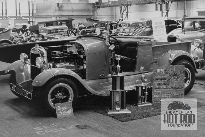 Joe Cardoza from San Jose showed up at the ‘66 GNRS with this beauty (GHC_237). The 1929 Ford Roadster Pickup was powered by a 322″ 1956 Buick Nailhead. It was hooked up to a ’39 Ford trans fitted with Zepher gears naturally. Out back the bed was shortened 10″ and the fenders bobbed. It was all covered with Naples Orange paint that complimented the black Naugahyde interior.