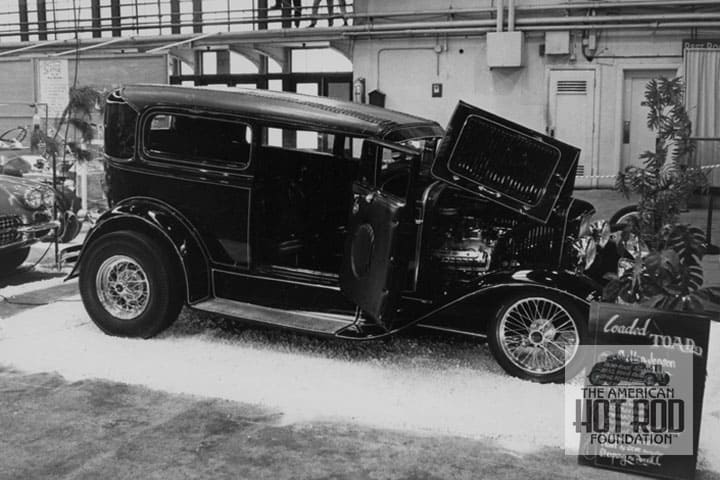 The 1966 Grand National Roadster Show Program listed this car as ‘Oldie but Goodie” but owner Shelton Jepson had other ideas and did a new show card calling the car “Loaded Toad” (GHC_238). Whatever you call it, the car’s a winner. Starting with a 1930 Ford two-door sedan 5 1/2″ were taken out of the front and 4″ out of the back to give it one mean chop. Those spoke wheels on the front running on chromed ’40 Ford suspension give it a nice in the weeds look. That’s a ’57 Olds under the hood that feeds a Hydro and a Olds third member. ’56 truck steering hung from a ’32 Chevy dash are some of the interior mods. It’s painted British Racing Green and Black but we bet it didn’t like to go around corners.
