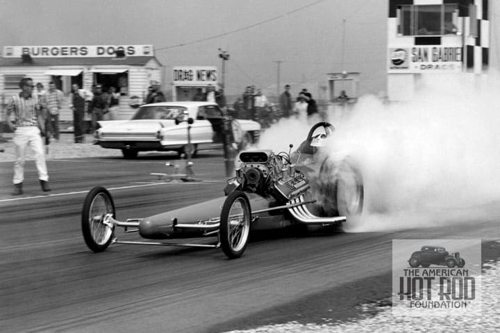Mixed in with the old stuff is another great shot that just happened to be taken by Erik Rickman on a nice overcast day at San Gabriel Dragstrip back in 1962 (JHC_1379). We see a guy called Television Tommy Ivo shoeing his Ivo Red “Barnstormer” and wearing C-T Stroker markings. Yep, that’s Tom’s white ’62 Cadillac “Tow Car” in the background. Tom and Rod Peppmuller had teamed up to build this one, the first of a dozen 124″ wheelbase chassisied wondercars. It’s possible that this was the same day that Tom had a match race set up with Don Prudhomme in the Greer & Black car.