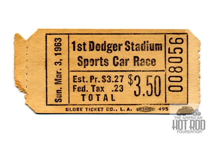 To add a little frosting to the above shot we present an original ticket stub from this very race (JMC_526). Note it only cost $3.50 to see the race and see those new fangled hot rods from Carroll Shelby called Cobras trounce Dick Guldstrand’s mighty Corvette.