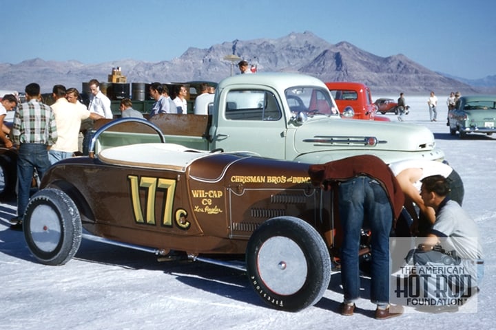 By 1953 Art would be the man to beat in his famous old #25 car ( purchased from his friend LeRoy Neumayer ) at tracks like, Pomona, Goleta, Paradise Mesa, and Santa Ana, setting a record of 9.40@140.08 in February of that year . Later that same year, the Chrisman clan would make an appearance on the salt flats at the Bonneville Speed Trails with their stunningly beautiful, rear engined, Ardun powered 1930 Model A coupe. In classic Chrisman fashion, they broke or or set records in every class in which they ran. This probably didn’t come as a surprise to those familiar with the Chrisman’s, as it was just the previous year ( 1952 ) that Art Chrisman would become a charter member of the Bonneville 200mph club driving Chet Herbert’s “Beast III” to a speed of 235.99mph.
