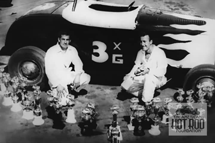 There are many kinds of reunions, but one involving a ’32 Ford roadster, its current owner and its former owners are quite different. This story starts in 1950, when the Berardini Bros. Pat ( born on August 31st, 1927 ) and Tony took Pat’s ’32 (#404) Ford, and Tony’s ’29 (#7) Ford, to the Santa Ana Drag Strip. Both cars had very hopped up engines. By the time the last flag came down in 1955 for the Berardini Bros. Racing Team, both cars had won hundreds of races and had set many drag strip records. They were top in their respective classes and were the very first over–all points champions, including the gas AND fuel classes, at the Drag Racers Inc. Awards Banquet in 1954. They achieved recognition from racers and fans alike. Not only were the ’32 and ’29 fast, but they caught the eyes of fans, as two beautiful racing hot rods.