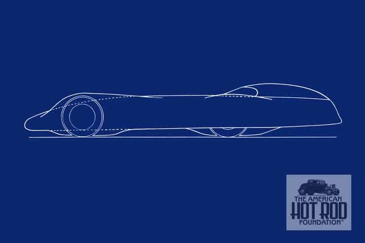 While we’re on the LSR kick check out our next image (JMC_1363). What we see is a concept drawing for Mickey Thompson’s Challenger I that was originally drawn by George Hill of Hill-Davis City of Burbank fame and appeared in the November ‘59 issue of our favorite hot rod magazine. Knowing what we do today about airflow over wing shapes, if this car had lost a rear wheel it could possibly have taken off like so many of the original streamliners did.
