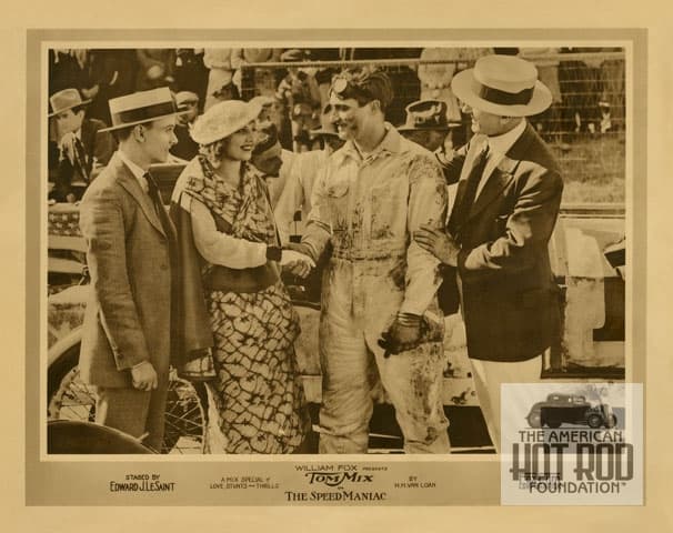 Last week we showed you a “B” Movie Poster featuring Ak Miller’s wild sports car. In the same group of old Lobby Cards, we ran across another keeper from an early day star that was class “A”. This one (JMC_4634) is for a movie called “The Speed Maniac” staring Cowboy Star and car guy Tom Mix. The movie was released way back in 1919 by Fox Film Corporation and was Mix’s 215th movie out of the 300 he made. Looks like the race driver always got the girl in the flickers. For a little trivia Mix bought an old horse arena and kept it for years before selling it to the Brothers Bonelli. If that name sounds familiar it should for it later the brothers renamed it Saugus Speedway. That’s where a bunch of X lakes-racers turned track-roadster racers learned their trade before moving on to places like Indy.
