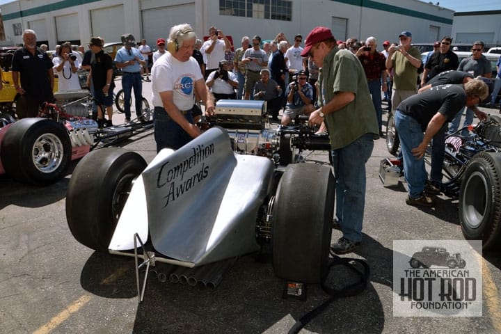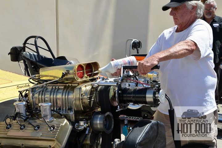 We just had to show you Mike Kuhl actually doing some work. Yep, he’s keeping Glen Way’s 2013 Groundshaker Jr’s 410cid pistons moving up and down with a little squirt of you know what. The original Groundshaker won it’s class at the ‘69 Winternationals and held records at Irwindale and OCIR. Its speed was 207 mph and its time was 7.67 seconds. That’s movin’ for a Fuel Altered back in the day.