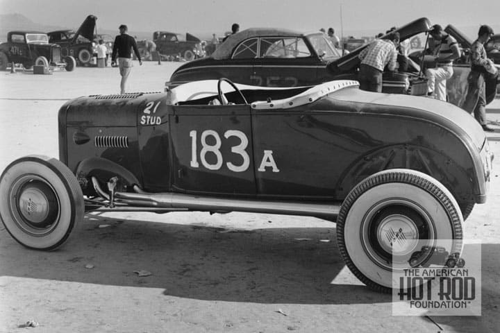 During the week the question was posed about what constitutes an A-V8. At first, that’s an easy one, it’s a Model A with a V8 flathead in it like Don Ferrara’s seen in DFC_179. This picture shows Don’s roadster at El Mirage on May 20, 1950, before taking a lap during a Russetta Timing Association meet. He was playing with the hot dogs who had their modern 24 studders and flaunted his use of an old 21 stud model. He turned a respectable 115.38 mph that day in his beauty.