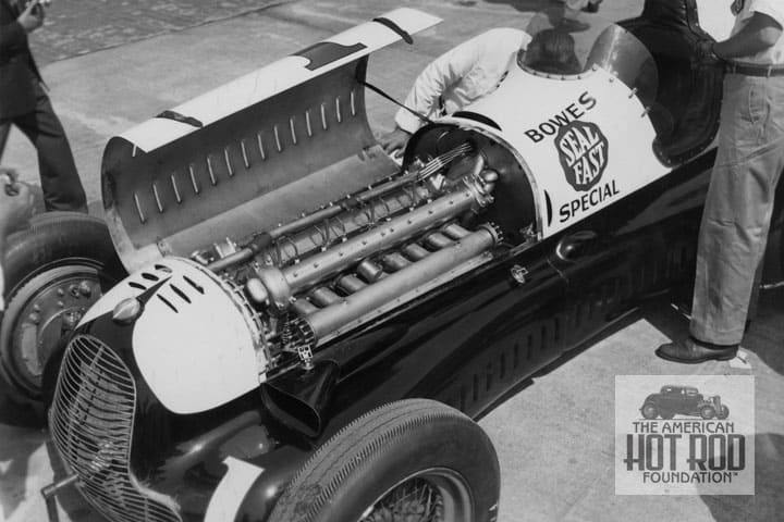 We just had to throw in this non-roadster shot because the chief mechanic on it was a hot rodder himself. Before the war, he had equipped Danny Sakai’s Modified with a set of his own heads and intake manifold. His name was Mal Ord. JMC_4560 is a great overhead shot that shows the Rex Mays’ driven Bowes Seal Fast car at the first post-WWII race held at Indy in 1946. The car was built by Myron Stevens and was powered by a supercharged Bud Winfield built straight-8 displacing 180″. Mays qualified the car in 14th place and only lasted 26 laps before the intake manifold gave up. We can trace the car back to ce the car back to being new in 1938, the first year that riding mechanics were done away with for the second time. Lou Meyer qualified the car in 12th spot and finished in 16th going out with a broken oil pump. In ’39 Meyer drove it again and started the race in second spot and finished the race in 12th after crashing on lap 197 and immediately retiring as a driver. In ’40 with new driver Rex Mays the car started on the pole and came home second. In ’41 Mays drove it to a second place finish yet again. The car missed the ’47 race and resurfaced in ’48 when Bill Cantrell raced it in the 500 as the Fageol Twin Coach entry minus the 8 and now fitted with a Fageol inline 6. He tried it again in ’49 and was a DNQ. After that, we don’t see it again at the race.