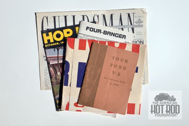 We were also rummaging through some of our collected goodies and thought we’d show you some of the odds and ends we haven’t got to yet (JMC_4627). Up front we have an original Ford V8 Car Reference Book from 1936. Inside, it lists the car’s new owner, one George DuVall Junior and is dated November 8, 1935. For you who have been living under your car for way to long, George is the designer of those funny windshields that turn up mounted on 1932 Ford Roadsters. There’s even a section in the booklet on how to remove a huuthe So-Cal Streamliner at El Mirage was the editor back then.