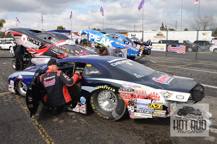 For the last of the Pomona shots today lets end with JMC_4966. Jimmy Lars Alund makes a final in-car check while waiting for the Top Alcohol Funny cars to finish their first round of qualifying at the 2014 Winternationalsmit Racing sponsored Pro Stock 2013 Camero powered by a GM500. Jimmy’s first lap in qualifying resulted in a speed of 210.31 mph in 6.580 seconds. At the end of the round, he stood in 11th spot among 17 runners. In round two he ran 211.39 at 6.574 and was now in 12th. On Saturday in round 3 of qualifying, he ran 211.86 at 6.546 and moved up to 10th. In round 4 he ran 211.76 in 6.550 to stay in 10th. In Sunday’s first round of eliminations, he faced Shane Gray and went down in defeat with a lap at 211.63 mph in 6.555 seconds after red lighting by .014 seconds. Gray went on to win wit a 211.69 mph run in 6.584 seconds. In the rear is Brian Hough’s ’09 Stang on the left and Jay Payne’s ’13 Stang on the right. Payne got to round 2 of eliminations then lost to Clint Thompson with a 258.91 mph lap in 5.681 against Thompson’s 76.17 mph lap in 11.169 seconds because he red-lighted by .028 seconds. Brian made it all the way to the final round and won over Sean Bellemeur with a 257.83 mph run in 5.571 seconds to Sean’s 257.78 mph run in 5.646 seconds. Sean had an incredible .007 reaction time to brian’s .034.