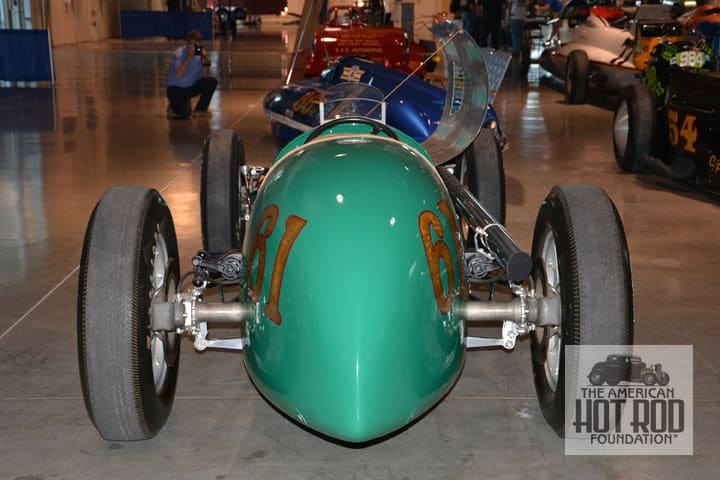 We can fast foreword to January of this year at the Century of Speed exhibit at the Grand National Roadster Show to see yet again the number 61 restored to its former glory (JMC_4910). Note the car ran disk brakes way back when and yes it was green. One wonders where the peanuts were/are (old-timers will get this one). The blue car in front of our green machine was originally raced in960 1960 with a Falcon six in it. It went by the was named Golden Commode. Journalists were kind and renamed it the Pumpkin Seed when it’s driver got into the Bonneville 200 MPH Club.