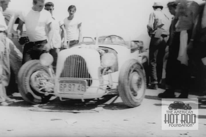 After driving this car to work during WWII and turning a lot of heads, Doug Caruthers brought his soon to be even more famous than it already was Modified back to the lakes on April 28, 1946 (MKC_019). He’s seen peeling out from the starting line. Under the hood was a Merc V8 fitted with Thickston heads. Doug ran 129.49 mph at this S.C.T.A. meet. Note how many and how close the spectators are to his car.