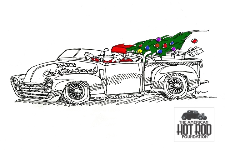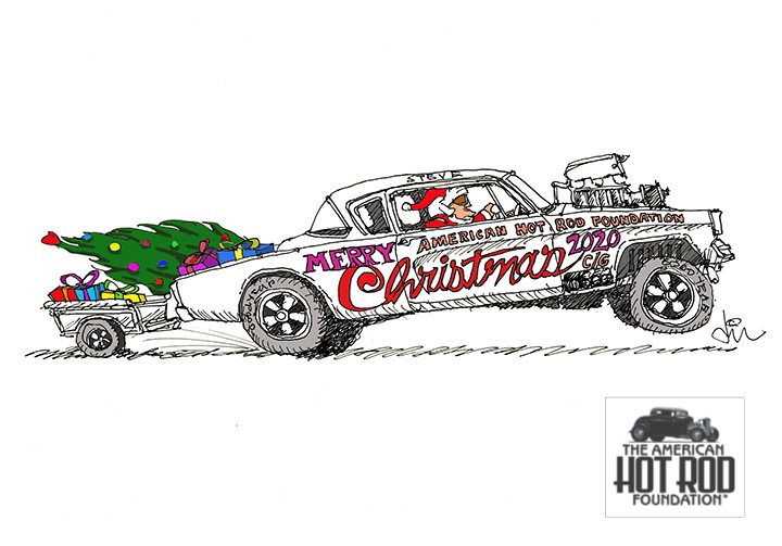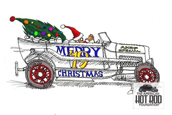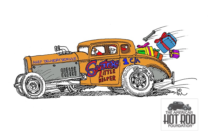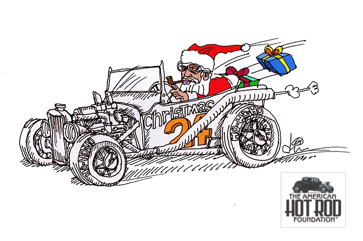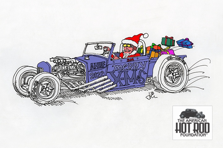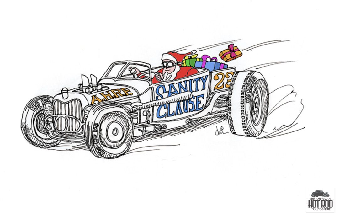 Each year around the Holidays, our intrepid AHRF curator, Jim Miller, dusts off his illustrator’s pen and offers up a fun little hot rod themed Santa scene to share with our community. This year we decided to provide this overview of Jim’s works through the years for anyone who missed them. Click on any image for a closer look and enjoy these fun little scenes as we send along best wishes for a wonderful Holiday Season to you and yours!