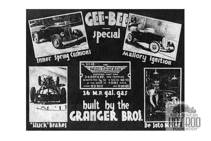 We delight ourselves in finding oddball stuff for you so here’s another one of those piece’s that leave us scratching our head for answers. It was a copy of an old advertisement touting a Gee-Bee Special that had run at a Muroc Timing Association meet back on June 30, 1935. We started a search by digging out our period phone book to see if we could find any mention of Gee-Bee or the Granger Brothers in it. We struck out on that one so the next thing we did was see if we had anything on 1935 races at the lakes. We found two. First, we checked on our results from the June 30, Muroc Timing Association meet that nobody seems to know about but we just happen to have entries and speeds for. We looked for a car that was powered by a De Soto and found none. We then checked our September 22 program and also came up with a nothing. Going back to the June results we looked for a 75.61 mph speed touted in the advertisement but didn’t find any. So far were batting zero. Rechecking all the speeds listed, we found that the slowest speed of the 37 cars we counted at the meet was 75.00 mph flat and that happened to be a “Stock” Chevrolet 6 powered something. The next to slowest speed was a Chevy 4 with an Olds 3-port headed ride that ran 76.27 mph. The next two slowest were a Model A powered car with a Riley C at 77.54 mph and a Stock Ford flatmotor powered ride at 77.58 mph. The more we thought about it running 75.61 mph, the more the whole thing became a hoax.