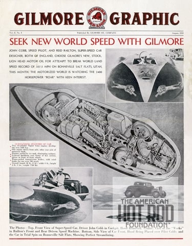 We just dug out this copy of Gilmore Graphic that was published back in August 1939 for you (JMC_4531). It talks about the upcoming adventures of its super-speed jockey, John Cobb, and his twin-engined, 24 cylinder monster that put out over 2400 horses. Bet you wouldn’t have guessed but it uses Gilmore Products. You will note the front and sides of the car were a copy of Gilmore Graphic that was painted black to make sure it tripped the timing lights.