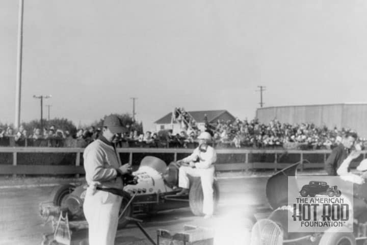 We just received a group of shots that were taken at the not so nice San Jose track on November 2, 1952, before the start of the San Jose 100 mile Champ Caroung fellow that was to make his name in motorsports down the road showed up and ran a Model A fitted with a Riley C head. His speed that day was a respectable 95.47 mph. We found a picture of this young gun taken two years later (‘37) sitting in Danny Hogan’s Midget racer (JPC_051). His name was Sam Hanks. What’s better yet is the shot is autographed.
