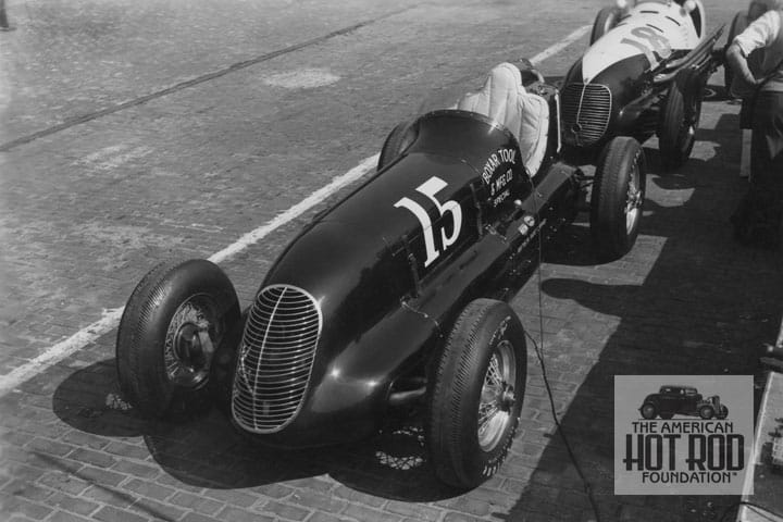 Another group of 24 shots we just received were shot at the first 500 held after WWII. Our unknown photographer was standing on the hot-pit wall during practice for the 1946 Spectacle when he snapped this one. Up front is the number 15 Joe Hosso entered Boxar Tool & Mfg. Co. Special that was driven in the race by Louis Tomei. Under the hood of the front-wheel drive car was one of Frank Brisco’s inline sixes that we can trace back to ’35. We can also date the Myron Stevens chassis to ’37 but the bodywork was all new for ’46. Lou qualified the car in 22nd spot but only completed 34 laps in the race before an oil line broke. He was awarded a 26th place finish. If you look real close there is an antenna on the headrest. The car was equipped with a Raytheon Radio for two way communications with the pits. Behind it is the number 18 Frank Brisco entered Maserati that wore Elgin Piston Ring markings. A 183″ straight 8 got the car scooting pretty well as it qualified in 11th spot with a speed of 121.139 mph. Driver Emil Anders brought her home for a fourth-place finish. Get a load of the straight reflections in the Maroon colored Stevens body. Not bad for a hammer, a dolly and a hand to feel for high-low spots.