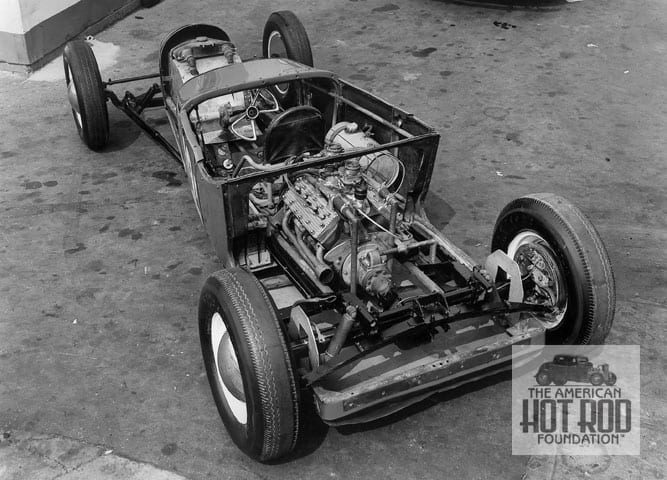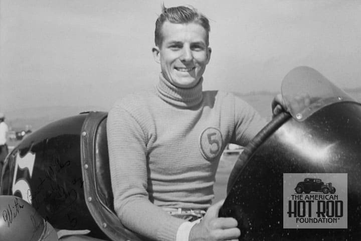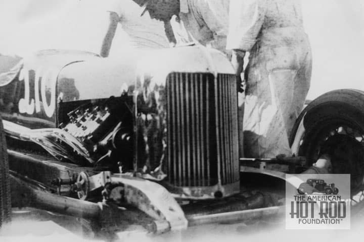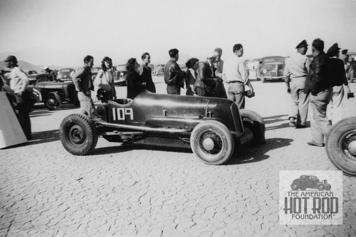 It’s only fair that the above two images work as a setup for another Cobb-s spelled land speeder by the name of Tom Cobbs out of Santa Monica, CA. Tom ran this ’29 Ford coupe at the drags, the lakes and even Bonneville in 1951. The car started life as a Model A 5-window coupe before the top was made detachable. The rear quarters windows and fender arches were filled, the top chopped and then the whole setup slid rearward on the chassis. A 268″ flattie was inserted. Tom went out and ran 154.639 mph for first in class on the salt. He then set the class record at 155.320 mph. The car was also a terror on the drag strips. With a Merc installed still holds the class record at the now non-existing Saugus strip at 112.5 mph. Tom ran many cars for many years and is an AHRF Pioneer.