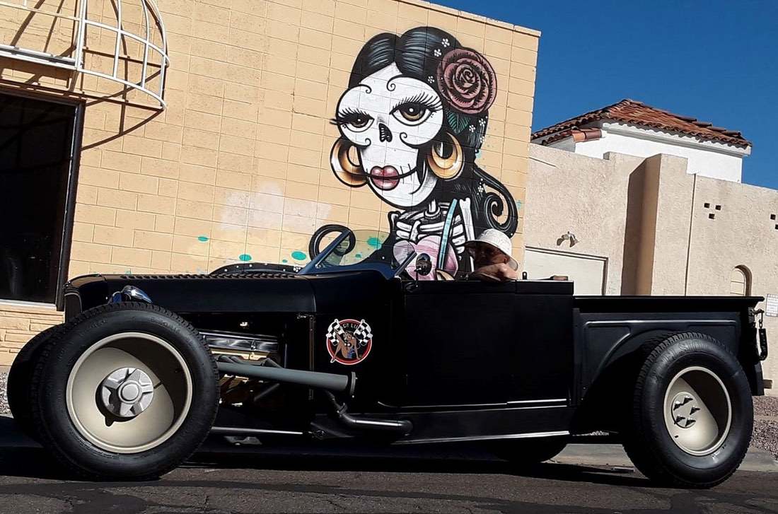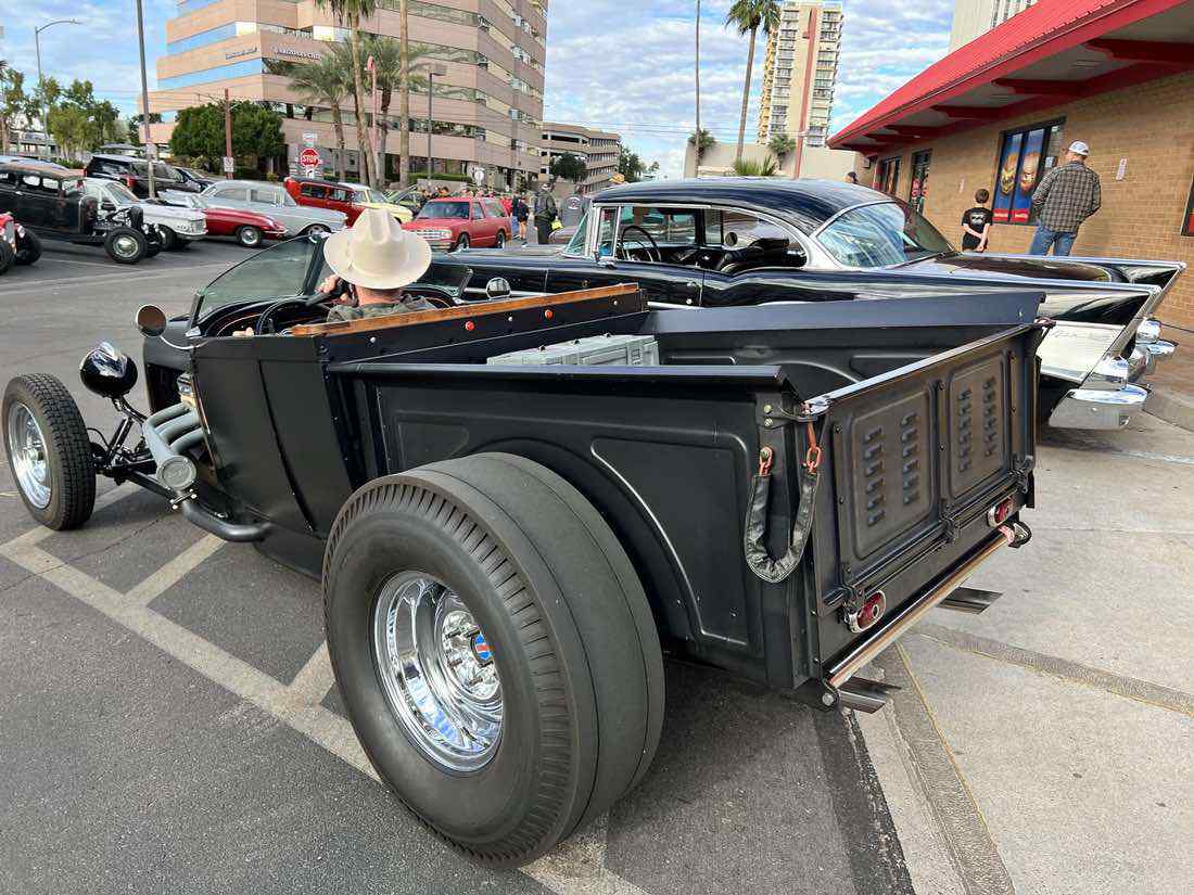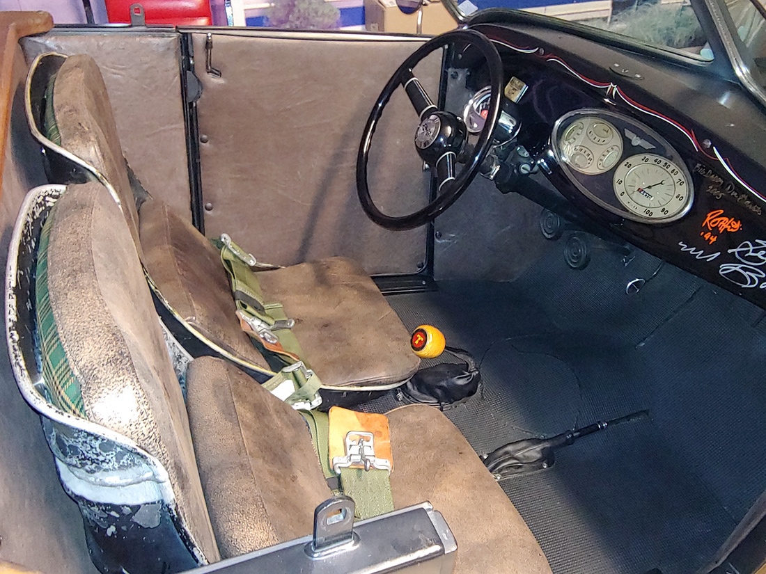 The Deuce Frame plants the car on the ground with plenty of attitude. Unique to this frame, it maintains adequate clearance from the ground while still achieving that Hot Rod Down-in-the-Weeds appearance. This Hot Rod was always going to be flat black. It’s the car the kid built around 1950 or so. It probably started with a banger or a flathead then along the way the owner saw a wrecked Corvette and bought the engine for his Hot Rod. The seats are from a WWII AT-11 Bomber. The Duke Hallack windshield is a special feature and really sets it apart from all other Roadster Pickups. Duke Hallack is a story in and of himself. A true post war Hot Rodder with the Dry Lakes in his veins. So this ole Hot Rod has seen a few iterations, I’m sure đ As for me, I’ve changed a few things around along the way. Mostly wheels. What a difference they can make. I hope you enjoy my little piece of Hot Rod fantasy. BTW, it’s been 18 years of trouble-free driving too.