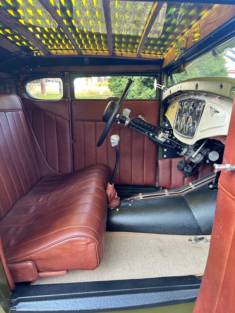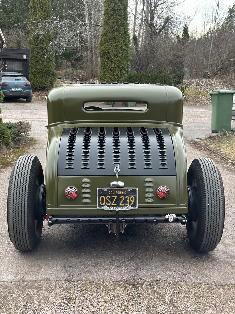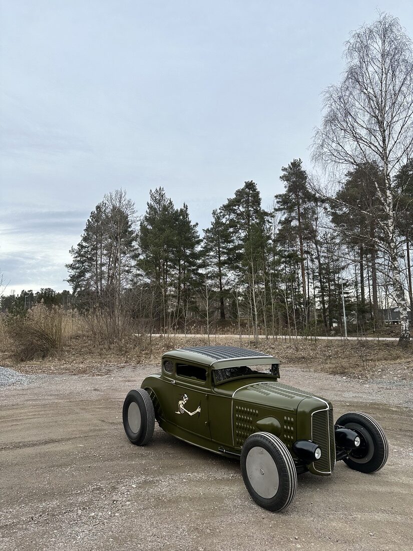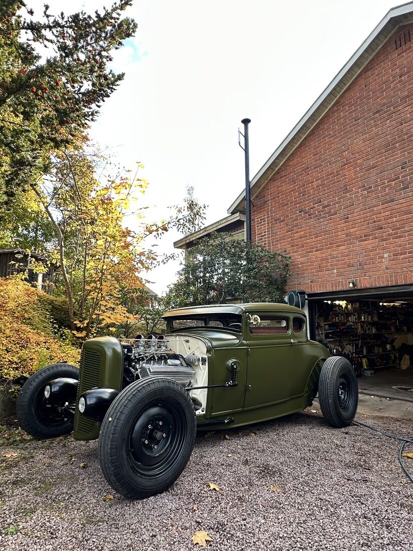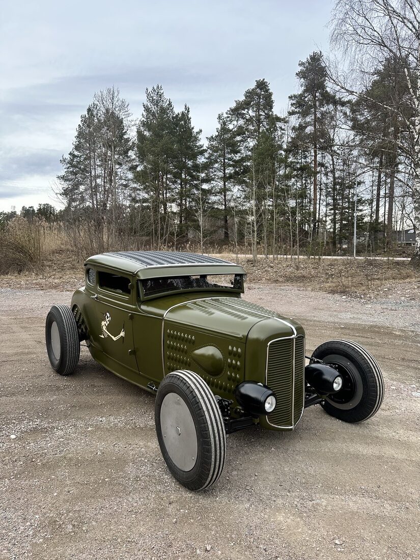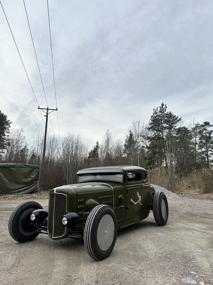 Rollingbones inspired model a coupe on 32 frame. Body dipped in acid to take all the rust and paint off it. 7” chop, 1002 louvers, leather interior, 1935 adler grillshell, 16” steelwheels, e&j headlights, chrysler 1937 tail lights, 270 dodge hemi, 3×2 intake with stromberg 97. Tremec t56 6speed manual, winters quickchange rear end, Custom made hood. Custom made dashboard, 32 firewall.