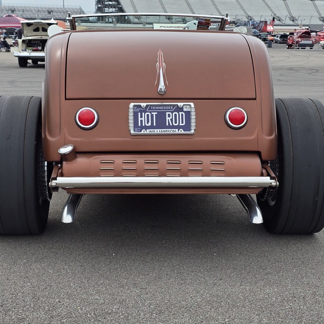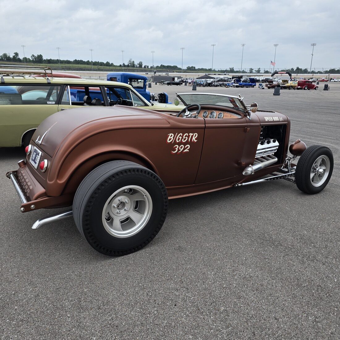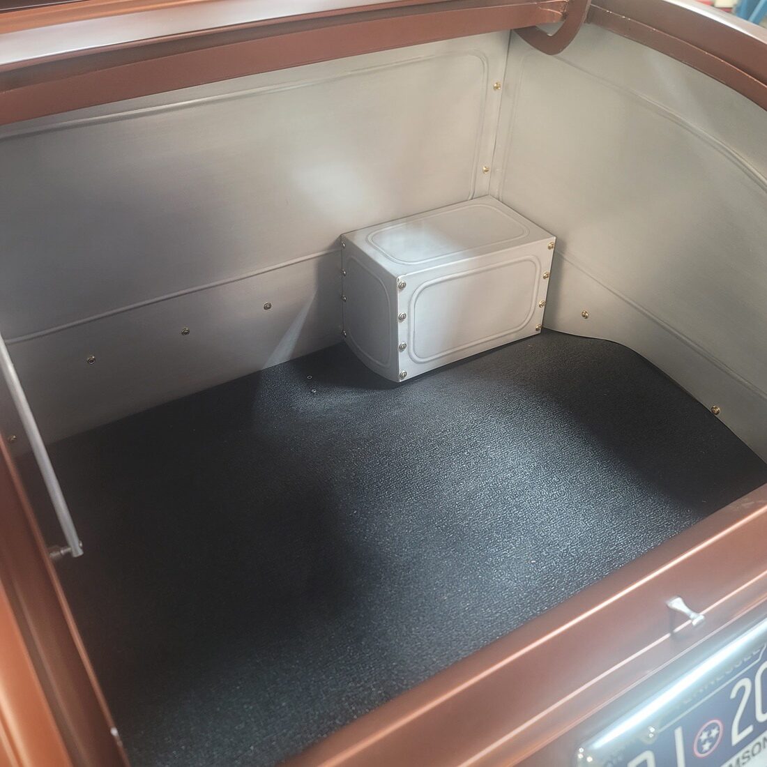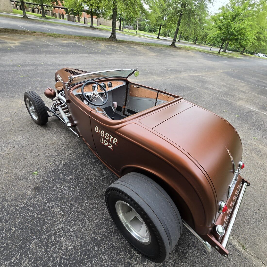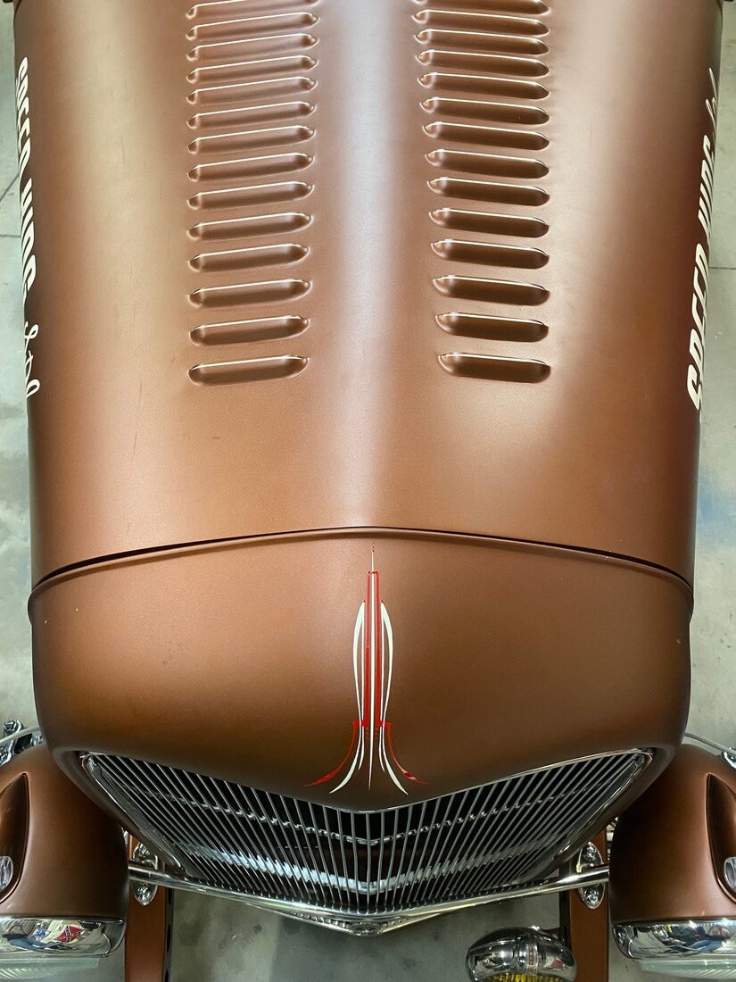 The body is a Wescott Roadster body that has been prepped and painted in a special mix “Dirty Penny” copper color with a matte clear finish. Out back the gas tank is even louvered! A Rodwell windshield keeps the bugs off the driver and passenger.