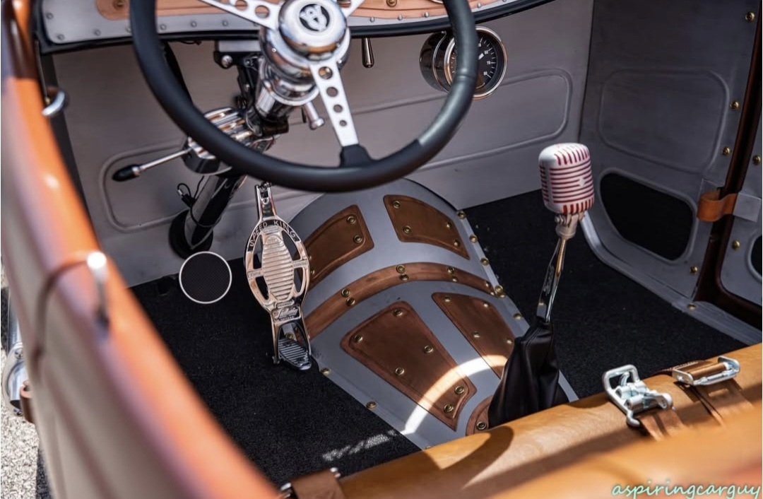 The interior is bare bones with aluminum and copper accents throughout. The gas pedal is a Ludwig ” SPEED KING” Bass drum pedal modified to run the throttle perfectly. The Lokar Shifter is topped with a ’50’s style microphone! The seat is a Glide , that has been modified by Speed & Design Interiors to sit lower in the hot rod and then covered with a distressed leather look material to add to the vintage vibe of this hot rod.
