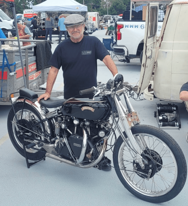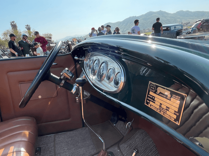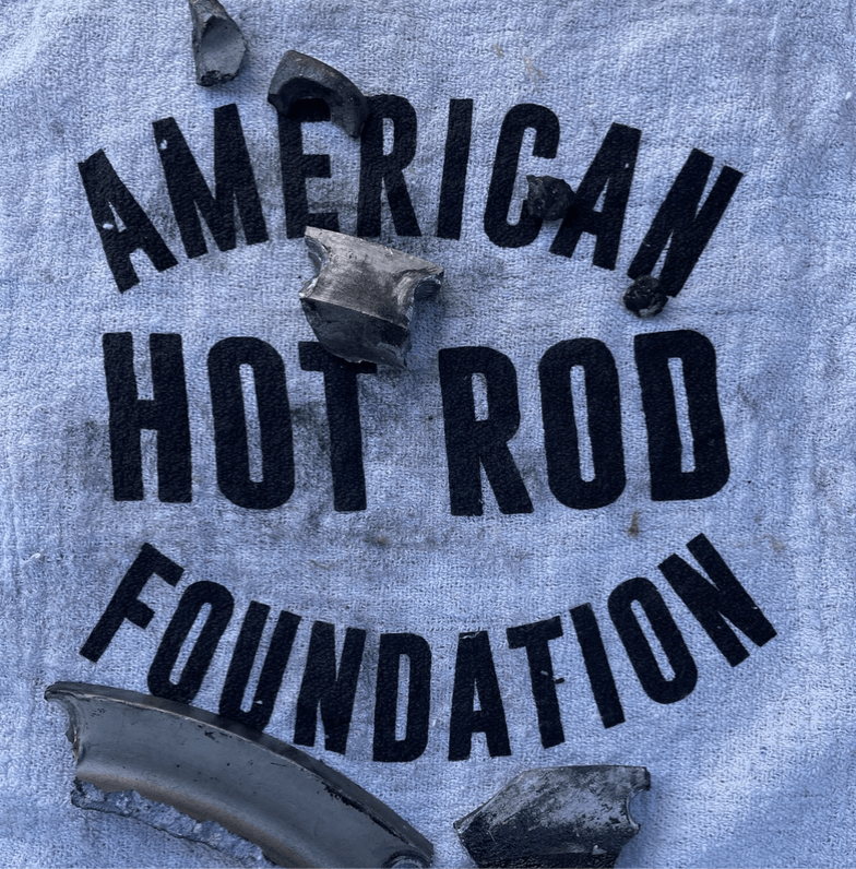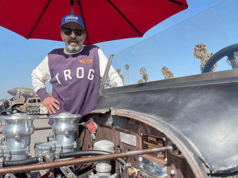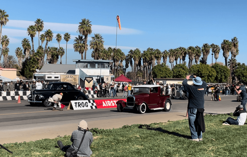 One of our favorite hot rodders and supporters of the AHRF is our good pal, Augie Esposito, seen here in the far lane at a recent TROG/Flabob airstrip event in his super cool, Cad-powered, ’40 Ford coupe. As Bruce Meyer once said about Augie,” He has the most impeccable taste.” We couldn’t have said it better, Big Bruce! Augie is one of those guys who was a hot rodder from birth and simply never stopped. This is one of the reasons we chose Mr Esposito as our AHRF Member of the Month back in August of 2021 ( click here to read Augie’s profile – https://ahrf.com/augie-esposito-august-2021-member-of-the-month/ ) . From his perfect ’32 roadster or ’32 3-window, to his stunning Vincent drag bike, Augie’s stuff is always “bitchin.” When we heard that Augie was taking his ‘50s Cad powered ’40 coupe out to the recent Pomona drag event to run the quarter, we were all ears to hear how the old girl would do. See, in classic Augie fashion, his Cadillac mill ain’t no run-of-the-mill mill. His is a mothballed relic from the 1950s that was intended for a full-race application that was never completed. So, it sat, wrapped in plastic, for decades until Augie came along and brought it to life. Topped with two fours, a lot of cylinder head work, and running a period Isky roller cam, the old Cad definitely makes a healthy sound. When unleashed, we were pleased to find that the old girl was knocking on the 13s at Pomona in the same state that Augie drives the car on any other day. That’s a damn respectable time and one that is as period-correct as any other aspect of what Augie does. Here we see him choosing off the Faruga pickup in his “Fordillac” at the inaugural TROG/Flabob airstrip drags back in late 2022.