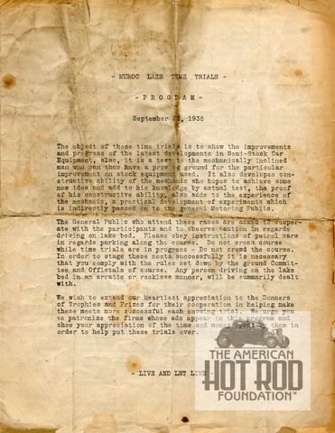 We lucked out in our gathering of goodies and found this rare Muroc Lake Time Trials Program dated September 22, 1935 (BNF_130). The listing inside includes car number, driver, hometown and the head used on the motor. 91 entries were listed but no speeds were shown.