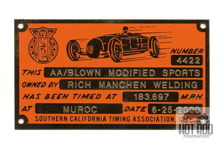 Last up is how things have changed but really haven’t. JMC_511 shows another Muroc Timing tag only this one is from June 25, 2000. Yours truly was behind the wheel on this one and had what we call a bad run. We were looking at a run of over 200 mph but that wasn’t going to happen because a burst plate on the blower went south and no one discovered it until the next morning. And no, we didn’t have a spare one. If we were smart we would have taken the car to impound, been certified for a record of 183.697 mph and been in the record books forever instead of being just another aborted run on race day. Oh well. Nobody said we were smart.