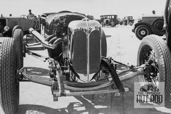 There was also a race held at Muroc on May 3, 1936, so let’s have a look at one of the competitors (BNF_019). Car no. 4 is a ’31 Ford Model A and the engine is fitted with a 4-port Riley head. The program lists one Pete Clark from Los Angeles as the owner of the ride. No Speed is listed in the results we have. Car no. 52 on the right was entered by a James Upshaw. There is a picture of Clark’s car in Drake’s book Flat Out on page 22. Our angle confirms the car is a ’31 and not a ’30. For those that don’t know Pete ran an establishment called the Uptown Garage and later was crew chief for Rex Mays stable of winning cars.