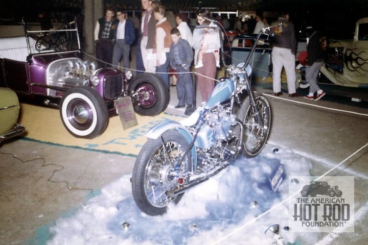 Marty just happened to stop off at a Hot Rod and Custom Car Show in Bakersfield and snapped a few ditties. One of them is CLA_143 that shows a wildly customized bike called Moonglow surrounded by spotlights and the obligatory for the day Angel Hair decoration. In the background, you can see the whacky ‘23 T called Tweetie Pie that was then owned by Ed Roth. We’re guessing this is ‘60 or ‘61 at this time.